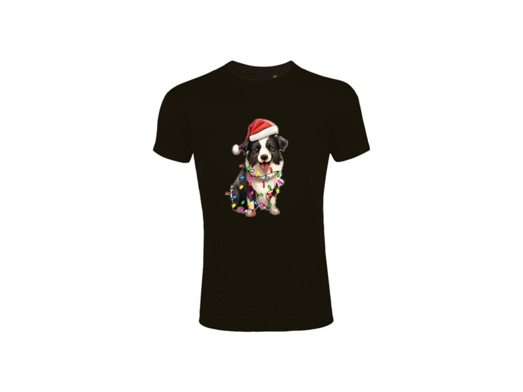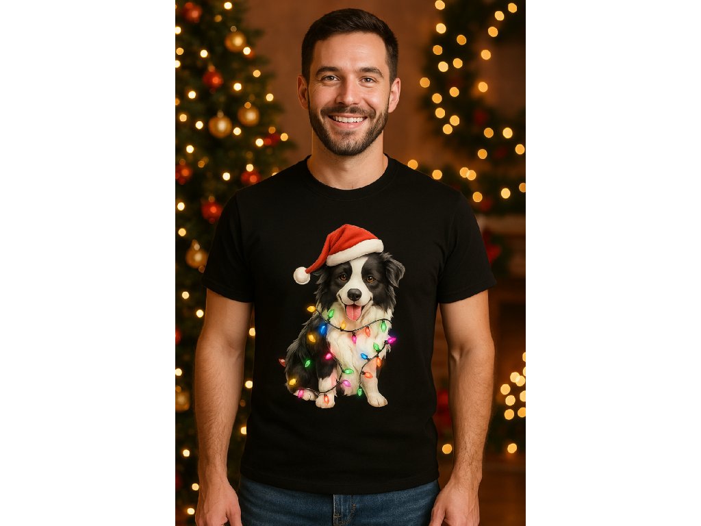 Černé vánoční tričko s roztomilou border kolií v čepici a světýlkách. Ideální dárek pro každého pejskaře, který chce šířit radost a sváteční náladu.
