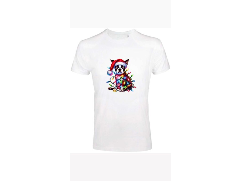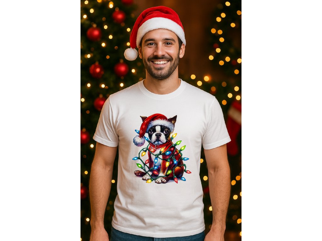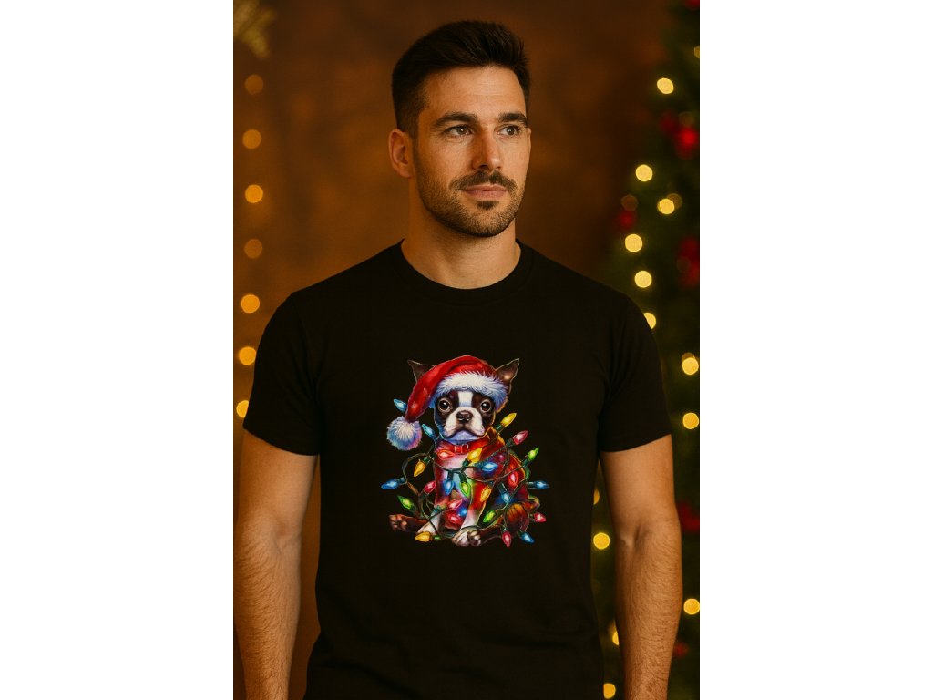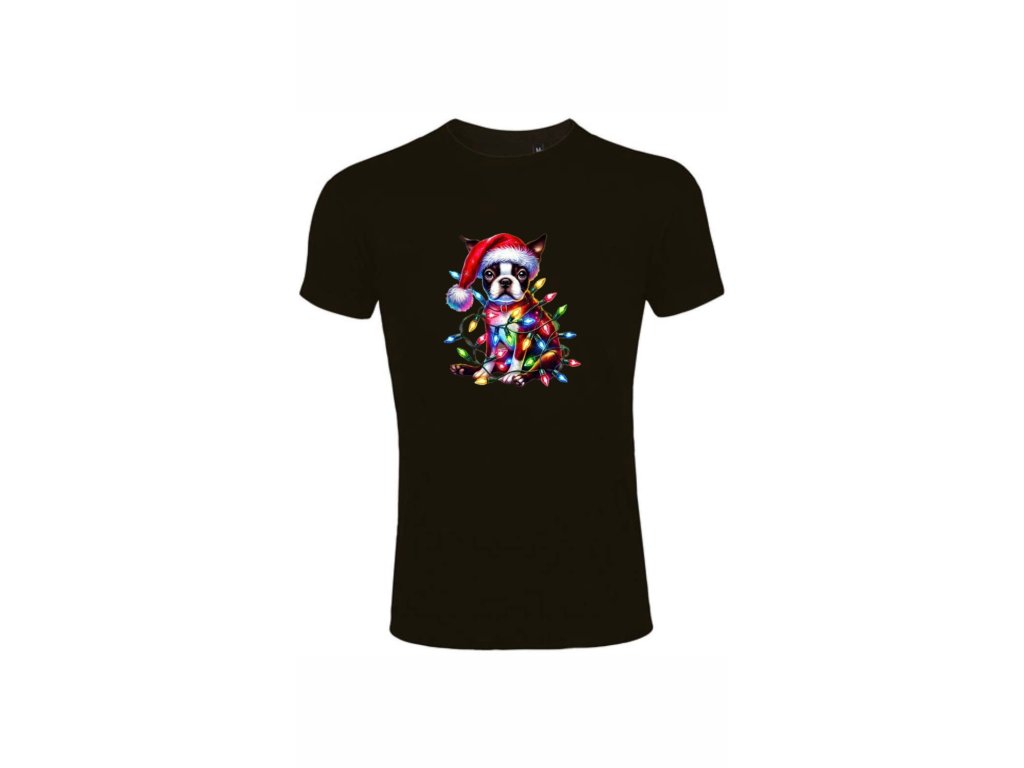 Stylové černé tričko s roztomilým buldočkem v santovské čepici a vánočních světýlkách. Skvělý dárek pro všechny milovníky psů a vánoční atmosféry.