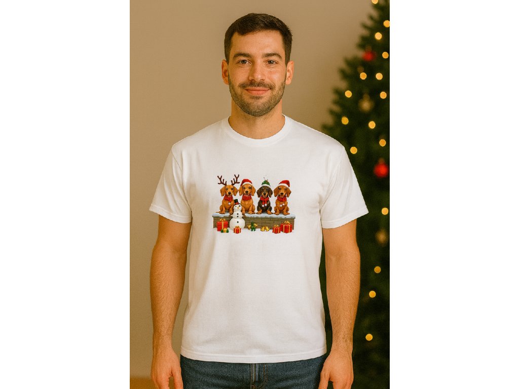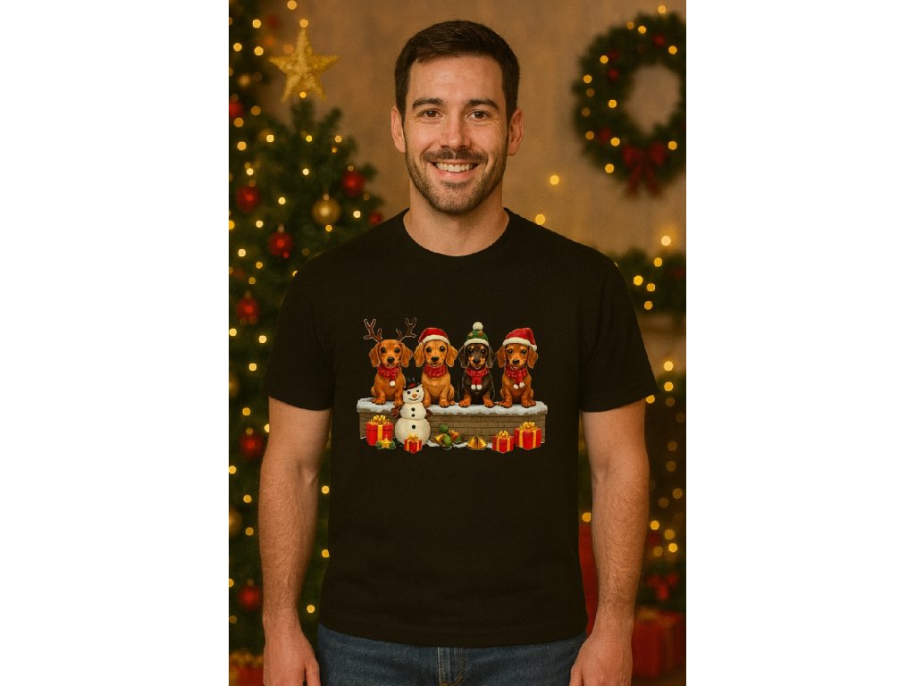 Vánoční tričko s motivem čtyř jezevčíků obklopených dárky a sněhulákem. Veselý a hravý design, který vykouzlí úsměv i tu pravou sváteční atmosféru.