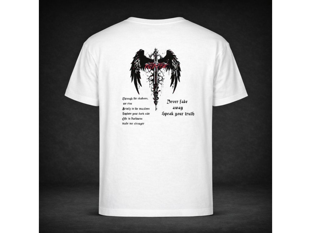 Tričko Dark Wings zaujme výrazným a tajemným motivem na zádech. Grafika meče s roztaženými křídly symbolizuje sílu, odvahu a cestu, kterou si člověk musí projít, aby našel svou vlastní pravdu.