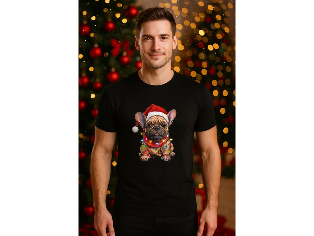 Vánoční tričko s rozkošným francouzským buldočkem v santovské čepici a světýlkách. Ideální pro každého, kdo miluje pejsky a sváteční pohodu.