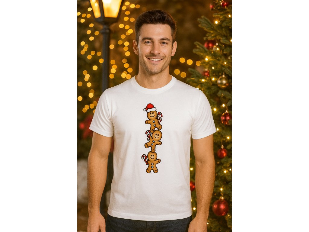 Vánoční tričko s potiskem tří usměvavých perníčků s lízátky. Veselý motiv, který přináší tu pravou sváteční náladu v hravém stylu