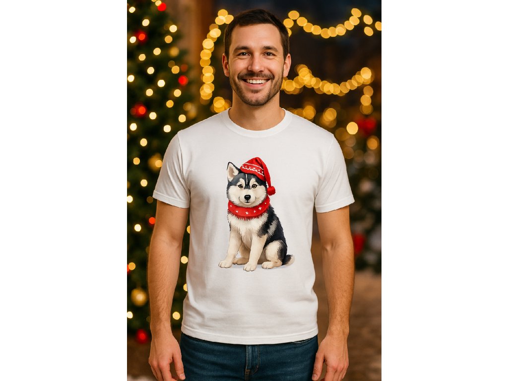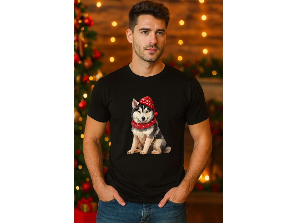Vánoční tričko s motivem huskyho v červené čepici a šále. Stylový a pohodlný kousek, který spojuje sílu, eleganci a vánoční pohodu.