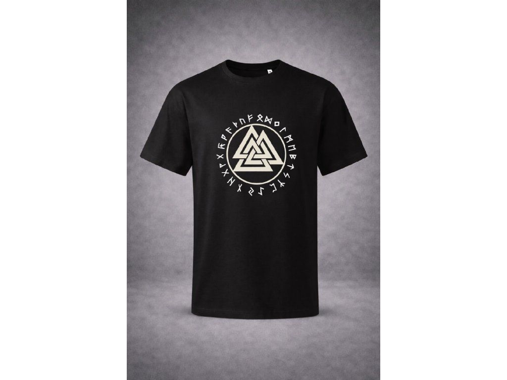 Tričko Nordic Symbol přináší minimalistický, ale výrazný design inspirovaný severskou symbolikou. Dominantní geometrický znak uprostřed obklopený runovými znaky vytváří tajemný a silný motiv, který působí nadčasově a stylově.