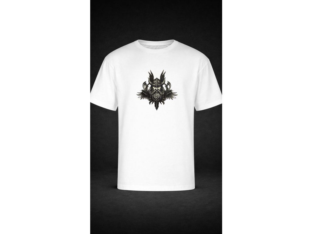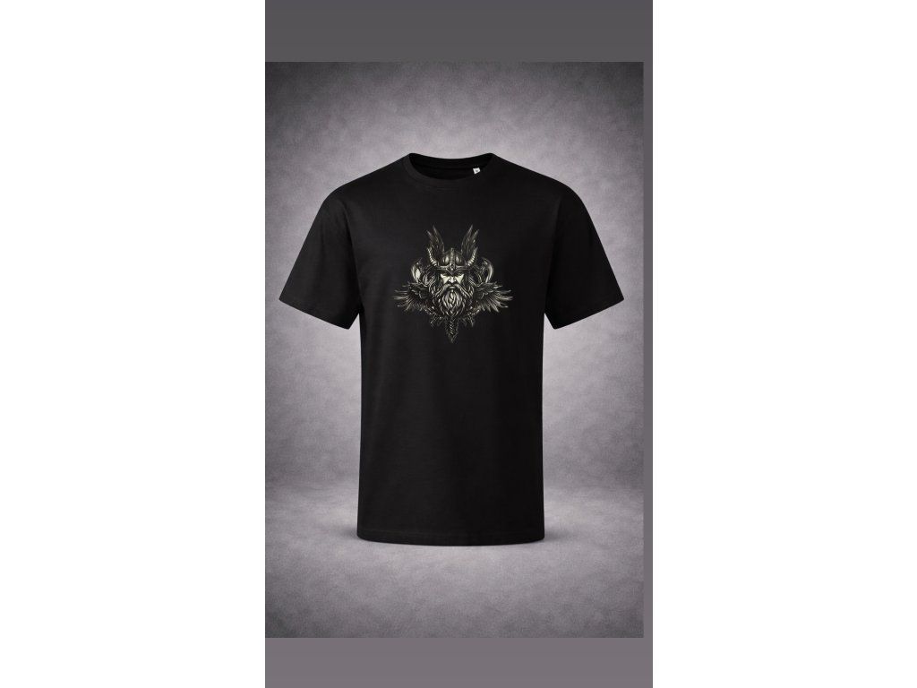 Detailní motiv vikingského boha s helmou a havrany symbolizuje moudrost, sílu a respekt. Čisté černo-bílé provedení dává vyniknout každému detailu a dělá z trička výrazný, ale stále minimalistický kousek.