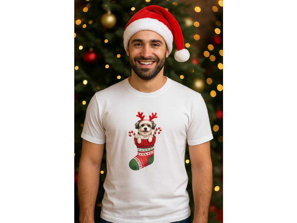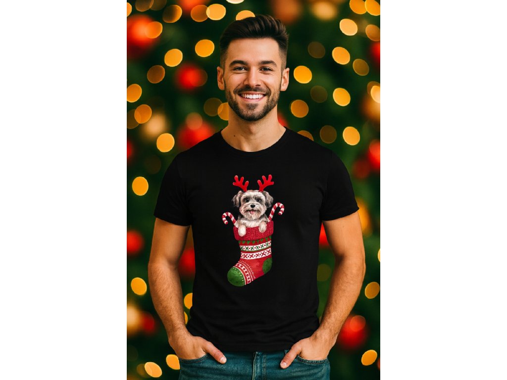Vánoční tričko s roztomilým pejskem v ponožce, sobími parůžky a cukrovými hůlkami. Hrátky se sváteční náladou v tom nejroztomilejším provedení.