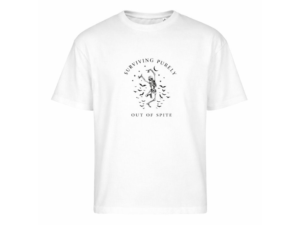 Minimalistický černý potisk na bílém podkladu působí čistě a stylově, díky čemuž tričko skvěle zapadne do moderního streetwear stylu. Motiv doplňuje text Surviving Purely Out of Spite, který dodává celému designu osobitý charakter.