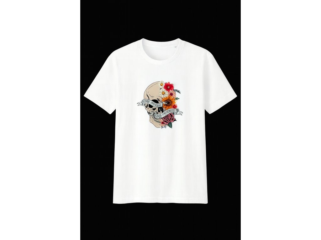 Bílé oversized tričko s originálním potiskem lebky a květin je ideální volbou pro milovníky výrazného stylu. Vyrobeno ze 100% kvalitní bavlny s vysokou gramáží 220 g/m², což zajišťuje pevnost, dlouhou životnost a pohodlné nošení.