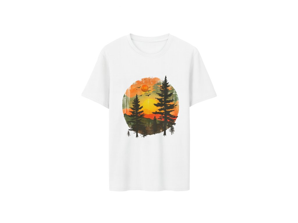 Tohle tričko je bílé, 100% bavlněné, s pohodlným střihem a klasickým kulatým výstřihem. Dominantou je výrazný barevný potisk na hrudi, který zobrazuje silhouette jehličnatých stromů před západem slunce.