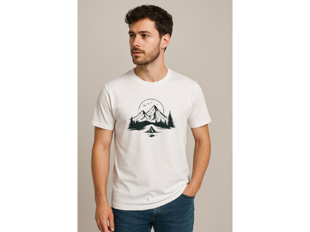 Objev krásu přírody s tímto stylovým tričkem Horský Klid. Bílý základ doplňuje minimalistický potisk s motivem majestátních hor, lesů, stanu a táboráku pod zapadajícím sluncem.