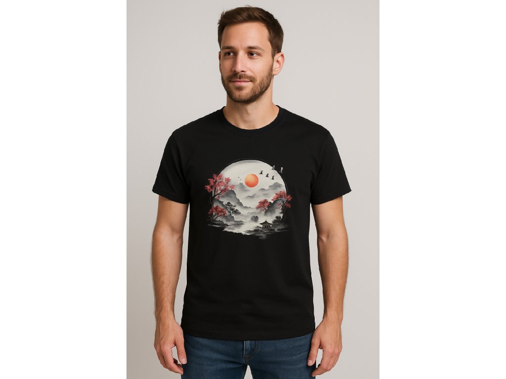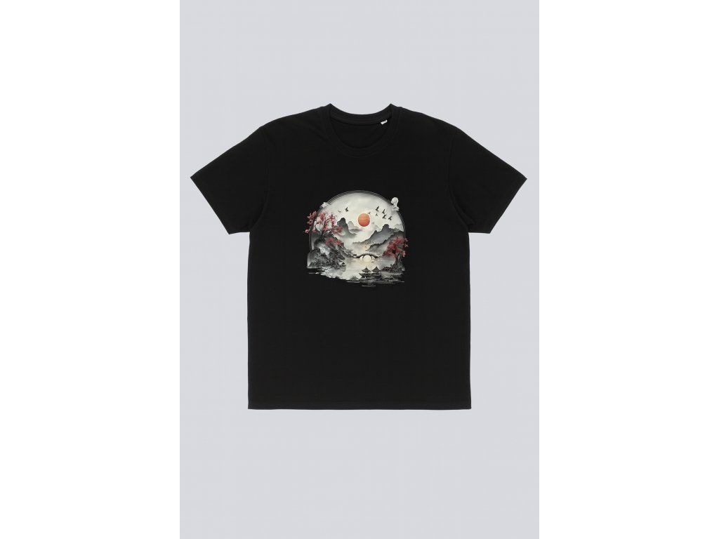 Objevte styl a lehkost v tomto černém tričku s originálním potiskem inspirovaným japonskou krajinou. Motiv slunce, hor, jezera a sakur vytváří harmonickou kompozici, která vynikne na každé postavě.