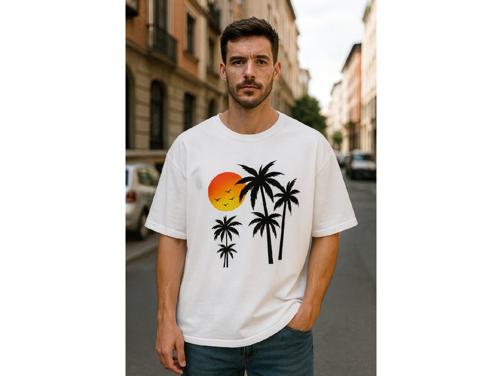 Na přední straně je výrazný potisk s motivem palem a západu slunce, který dodává tričku letní, uvolněnou a moderní atmosféru. Ideální volba pro ty, kdo hledají styl i komfort v jednom.